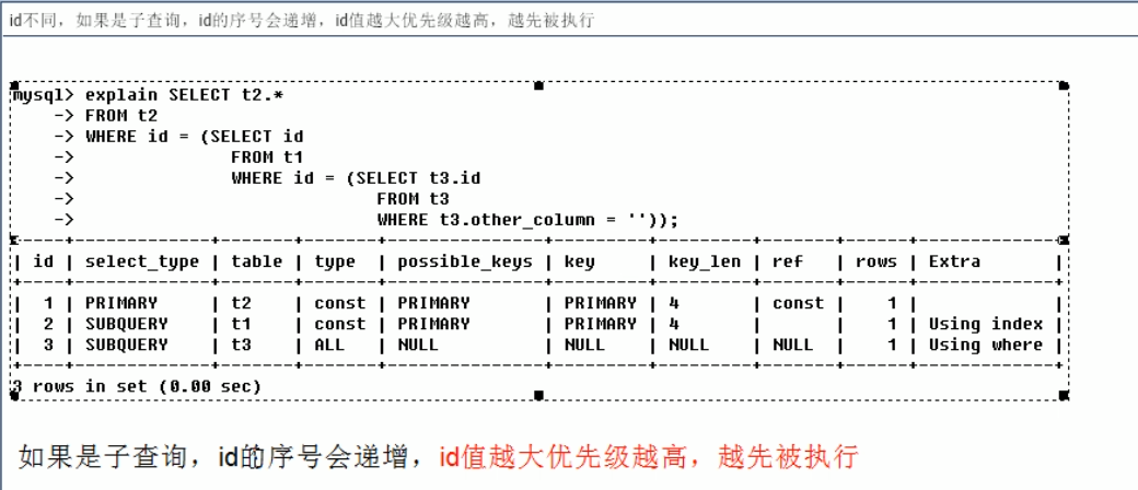 union --两个select语句普通联合查询,后面的被标记为union,如果union出现在子查询中,则外层查询被标记derived