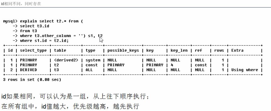 id相同不同都存在,id大的先加载,id相同的按从上到下的顺序执行 (derived2 = 由id=2的表(t3)衍生而来)